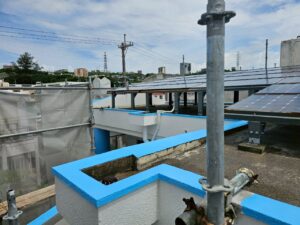 沖縄市桃原2階建て住宅にて色替え塗装が終わり、防水作業を行いました。