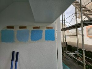 弊社では施主様に平均4色程度選んでもらい、実際に壁に塗ってどの色がいいかをご提案しています。